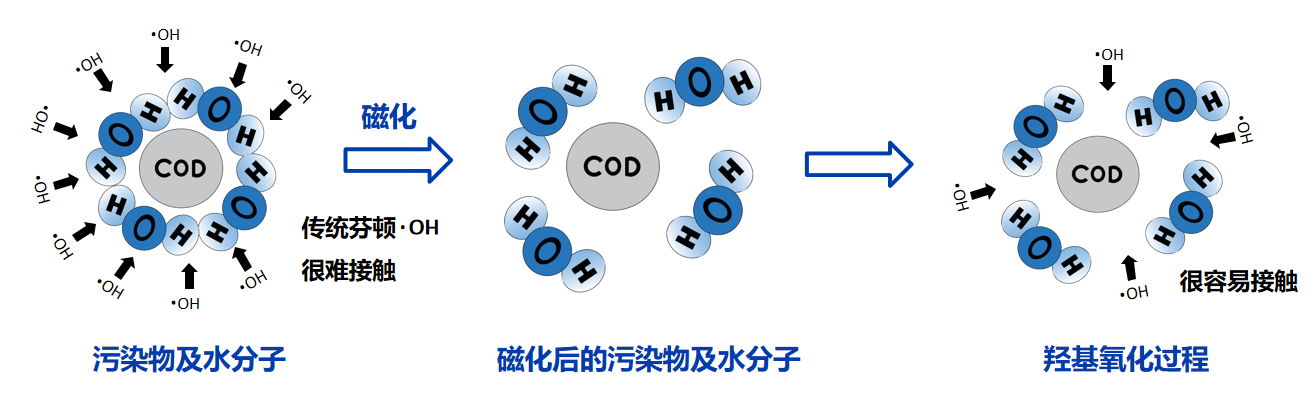 2、Super Cheap磁芬頓:先將廢水磁化,改變污染物分子與水分子之間的排列次序,采用定點清除的方法去氧化COD,H202的消耗量極低,只有傳統Fenton的30-40%。