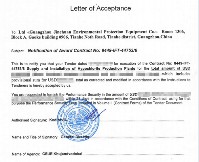近日,我司收到塔吉克斯坦杜尚別水廠的中標(biāo)通知書(shū),確定我司為該項(xiàng)目次氯酸鈉發(fā)生器的供應(yīng)商。