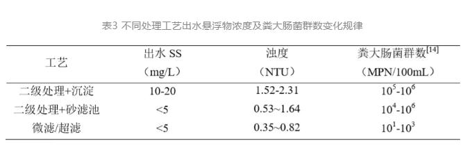 水中的懸浮顆粒物影響水中病原微生物含量,不同處理工藝出水懸浮物濃度與糞大腸菌群數如表3所示。同時懸浮顆粒物還能夠對消毒效果產生直接影響。通過協同消毒工藝前端砂濾、膜過濾等處理單元的設置,提高水中懸浮顆粒物的截留效果。可有效提升臭氧、紫外與次氯酸鈉對直接暴露在水中的病原微生物的滅活效率,過濾工藝在對致濁顆粒物去除的同時伴隨著部分病原微生物的截留。