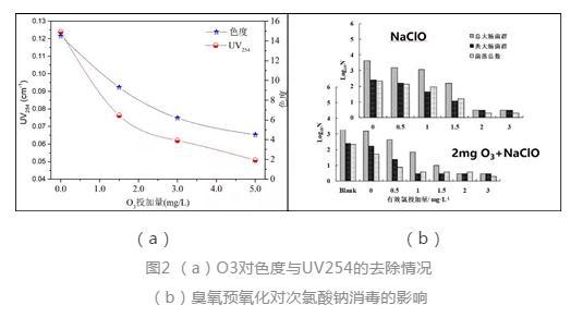 作為協同消毒技術體系的首個工藝單元,臭氧在氧化有機物污染物的同時,可以部分滅活病原微生物,實現與下游紫外、次氯酸鈉的協同消毒作用。臭氧氧化能夠顯著降低色度與UV254(圖2a)。2 mg/L的臭氧預氧化能夠將出水色度控制在10°以下,且紫外光透射率提升30%。在此基礎上,2 mg/L的臭氧預氧化則可將糞大腸菌群數降至3 CFU/L,且所需次氯酸鈉投加量較單獨次氯酸鈉消毒可降低近50%(圖2b)。