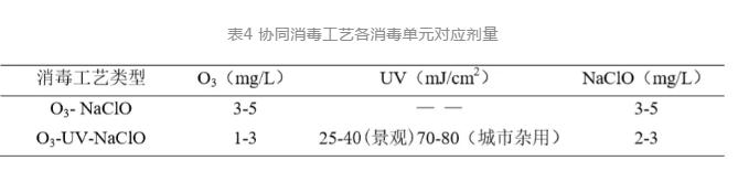 3)“O3-NaClO”協同消毒工藝,臭氧劑量維持3-5 mg/L,NaClO劑量根據水量與接觸池(清水池)容積維持CT值不低于8 mg·min/L可以較穩定的實現糞大腸菌群<2 CFU/L的消毒效果,同時節省NaClO投加量。“O3-UV-NaClO”協同消毒工藝,臭氧1-3 mg/L的投加量能夠提升30%紫外透射率,在紫外消毒單元設計劑量下(景觀用水30 mJ/cm2,城市雜用水80 mJ/cm2),紫外出水能夠實現糞大腸菌群<2 CFU/L;后續根據再生水用途及管網輸配要求進行適當補氯,保障出水余氯達到相應標準。