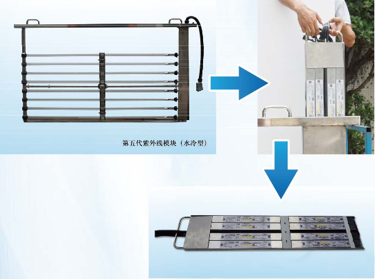 4、采用雙極粗細機械清洗設計,避免紫外線系統(tǒng)長時間停運后清洗造成套管損裂現(xiàn)象。
